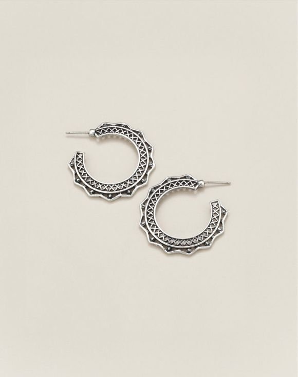 Highlighting the beauty of the Southwest, these unique hoop earrings are made from antiqued silvertone with hammered texture, creating the look of artisanal jewelry.