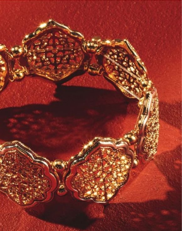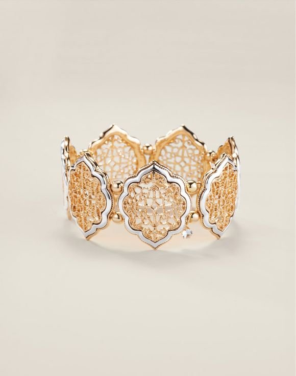 With graceful and elegant motifs reminiscent of Moroccan artistry, this refined stretch bracelet is intricately made from two-tone metals (goldtone and silvertone). The scalloped filigree designs reflect the intricate beauty of Moroccan architecture. Matching necklace and earring set also available.