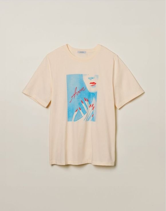 Channel classic glamour in this ivory tee featuring a retro-inspired graphic. With vibrant red nails, lips and the iconic Avon logo, it’s a striking nod to vintage beauty and Avon’s iconic past. Center back length: 29″ on L.