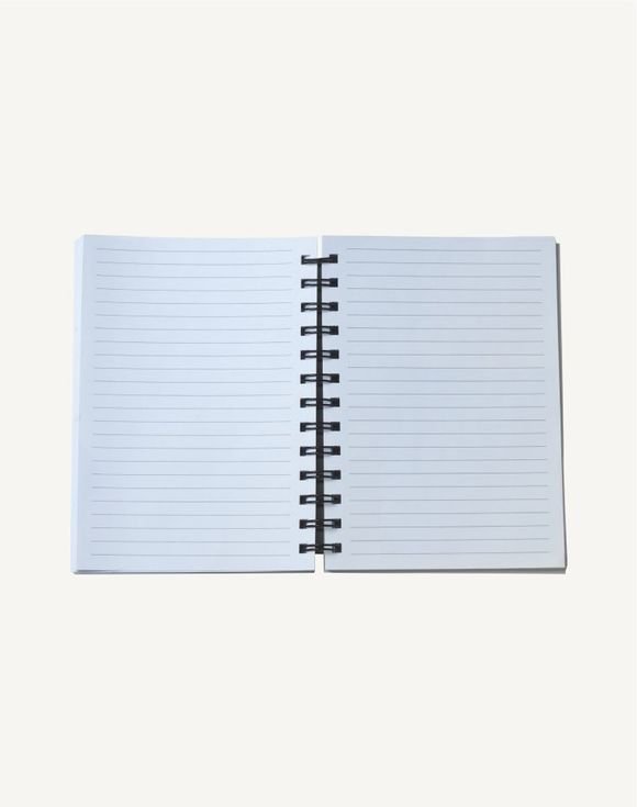 Black spiral notebook with multicolor logo print on cover. Includes 100 lined pages and 2024-2026 calendar. Man-made materials. 5″ W x 7″ L. Imported.