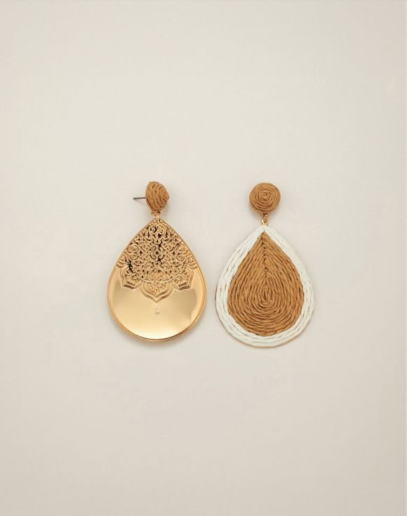 The quintessence of summer chic, these teardrop earrings are made from natural-colored raffia-like drops set in goldtone. Imported.