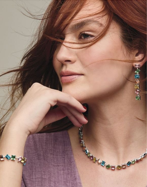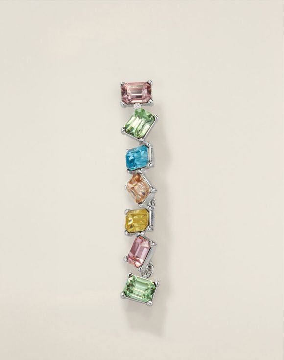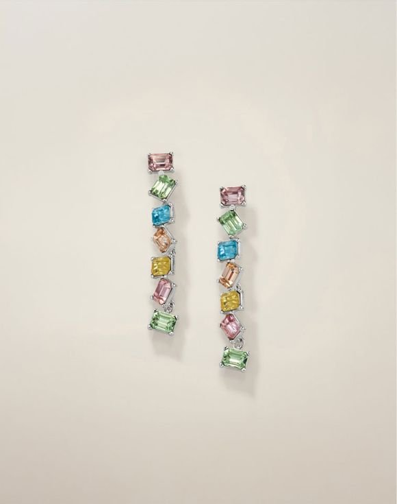 Dazzling drops of rainbow-colored rectangular stones lend a playful elegance to your jewelry collection. Set in silvertone, this light-catching pair are true conversation pieces. Matching necklace and bracelet also available.
