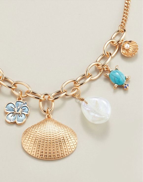 Add a playful touch of seaside charm to your look. A myriad of sea-inspired symbols dangle from a lustrous goldtone link chain— the perfect accessory for a beachside look.