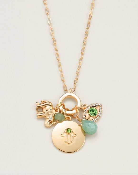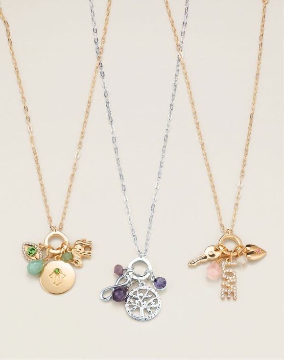 Set the pace for the day with a necklace featuring positive mementos for an extra touch of sparkle and good vibes. Available in three styles: luck/green/goldtone, family/purple/silvertone and love/pink/goldtone.