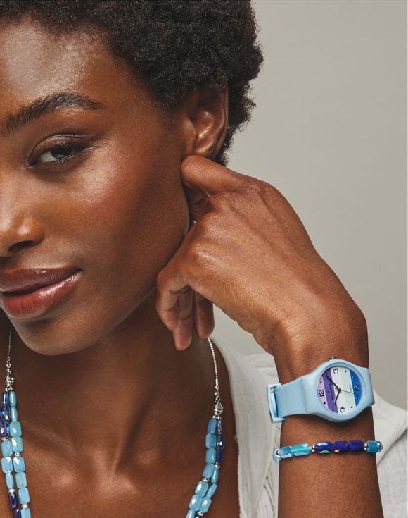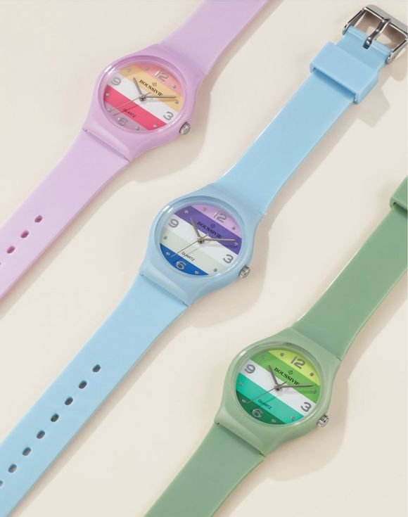A stylish timepiece that combines pastel hues and a modern design. Featuring a color-block pattern with bold stripes, this watch adds a pop of color to any outfit. Available in three shades: green, blue and purple. Matching necklace and bracelet also available.