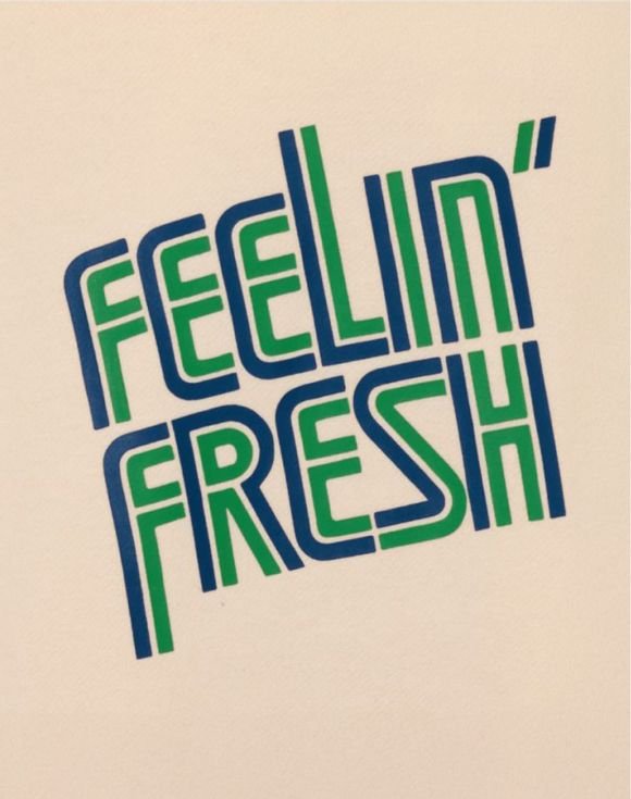 Avon beauty fan mode: on. This ivory pullover hoodie with vintage Feelin’ Fresh logo has a kangaroo pocket and blue/green logo print. Unisex. Center back length: 27 ½” on L. Imported.