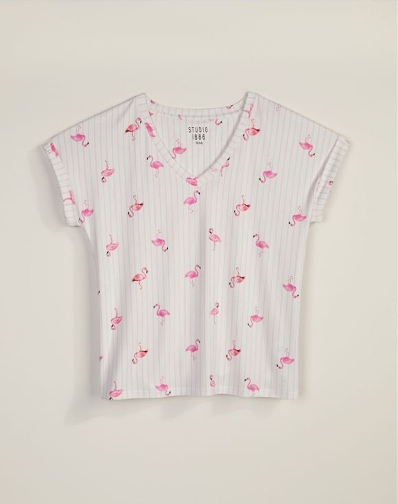 Bright pink flamingo print instantly evokes fun, sunny days. This 2-piece striped pajama set adds a cheerful and eye-catching touch to your loungewear. Center back length: 23 ½” on M; 25 ½” on 1X. Inseam: 21 ½” on all sizes. Imported.