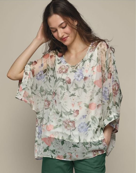 A sheer overlay top printed with a bouquet of exquisite blossoms strikes the perfect balance of elegance and femininity. Featuring flowy 3⁄4-length sleeves, this top swings gracefully with every step. Center back length: 26″ on M; 28″ on 1X. Imported.