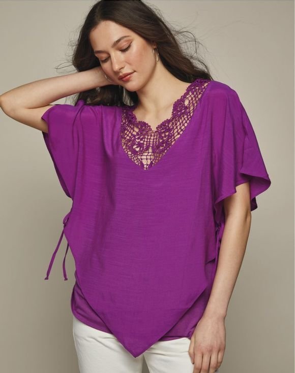 Perfect for sun-drenched days and balmy evenings. This floaty overlay top in majestic purple is styled with a self-lining, lace trim at neckline and side ties. Center back length: 25″ on M; 26″ on 1X. Imported.