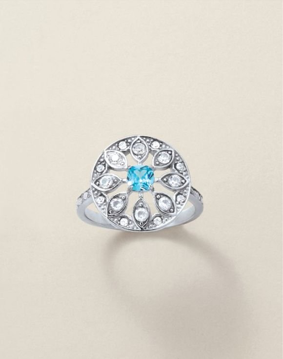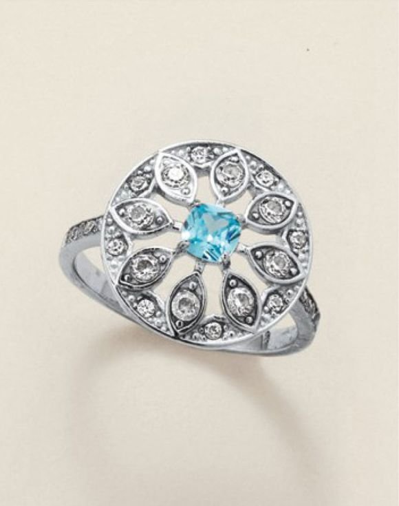 A timeless floral-inspired ring is the embodiment of beauty and grace. A radiant aqua-colored center stone is surrounded by sparkling clear accents and set in in stainless steel for lasting durability.