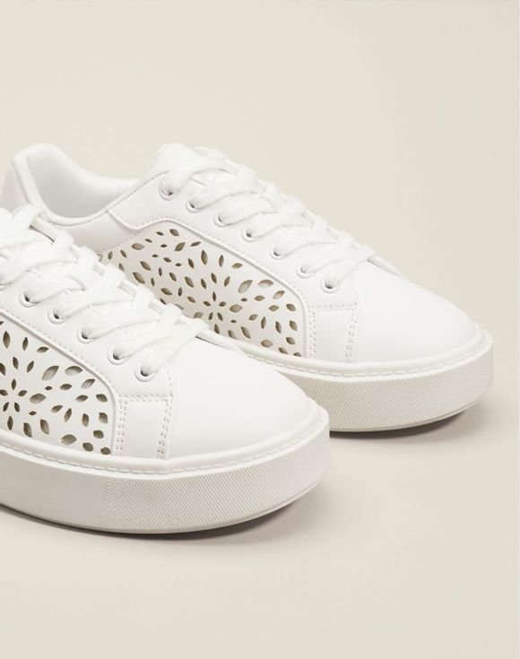 With a design evoking traditional floral lacework, this white leather-like sneaker stands out wherever you go. The versatile white color pairs effortlessly with both casual and dressy outfits, while the perforated floral pattern adds a touch of elegance to your look. Imported.