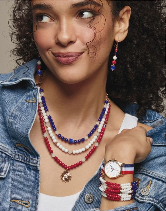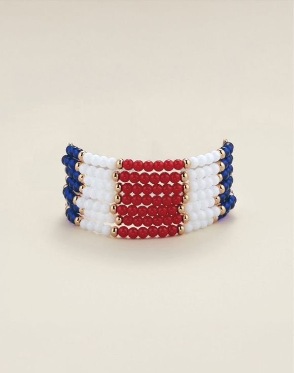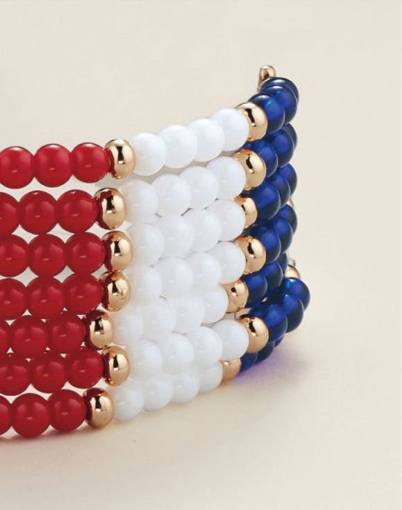 Showcase your patriotic spirit in style! A multi-layered beaded design features a striking mix of red, white and blue beads, creating a vibrant and stylish look.