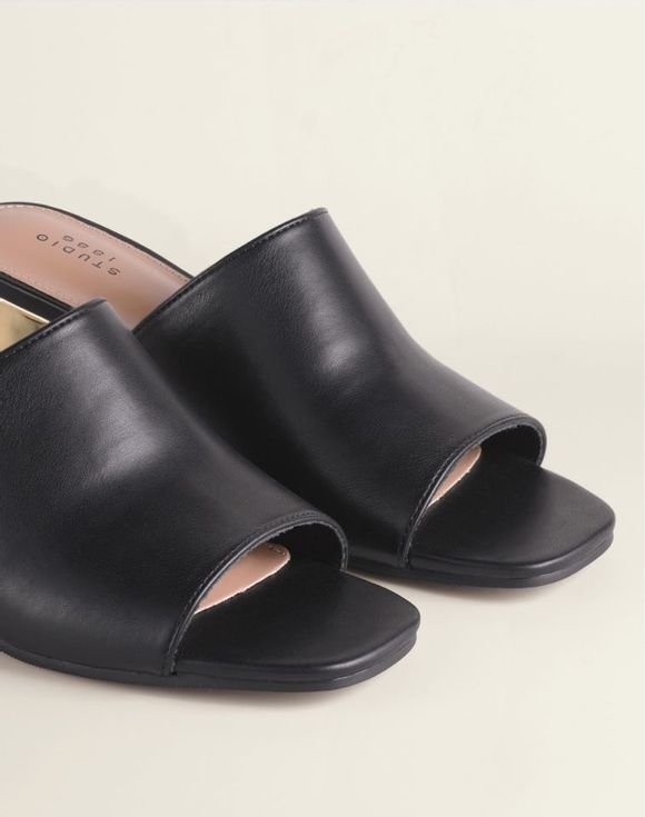 Slide into style in an elevated mule with a golden metallic block heel. Black open-toe sandals complement everything from relaxed to refined looks. Imported.