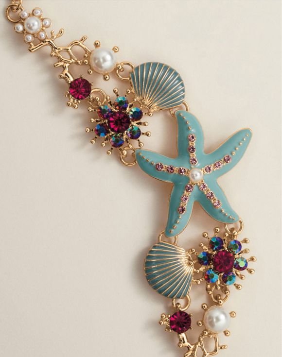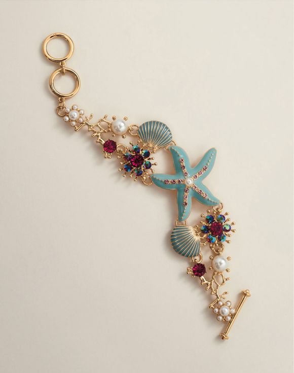 Make waves with an enchanting sea-themed bracelet. Vibrant turquoise starfish and seashell motifs are highlighted in a pearly-accented goldtone setting as a dazzling tribute to the beauty of the sea.