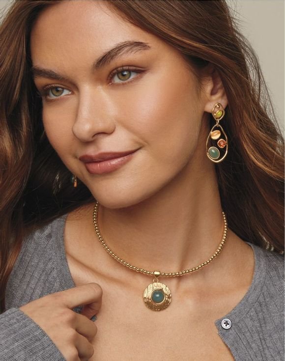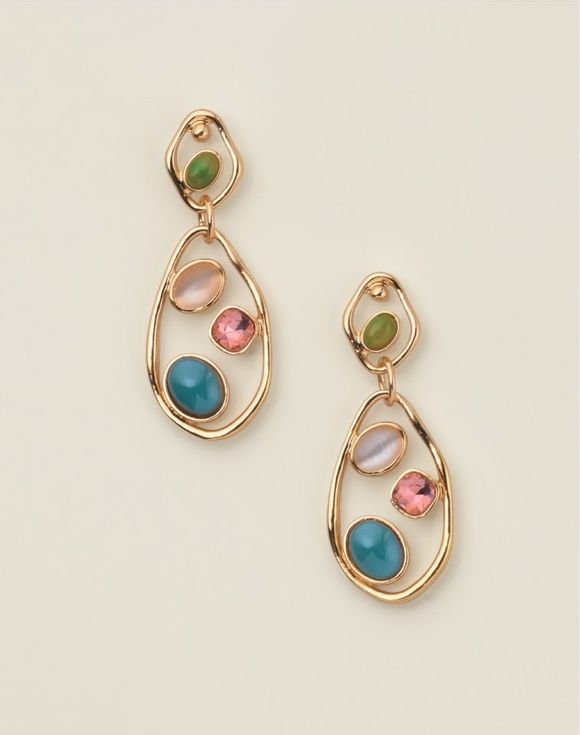 Softly radiant with a touch of nature’s charm, these drop earrings add a hint of serenity to any look. A colorful arrangement of earthy gem-like stones are set within an organically shaped goldtone frame