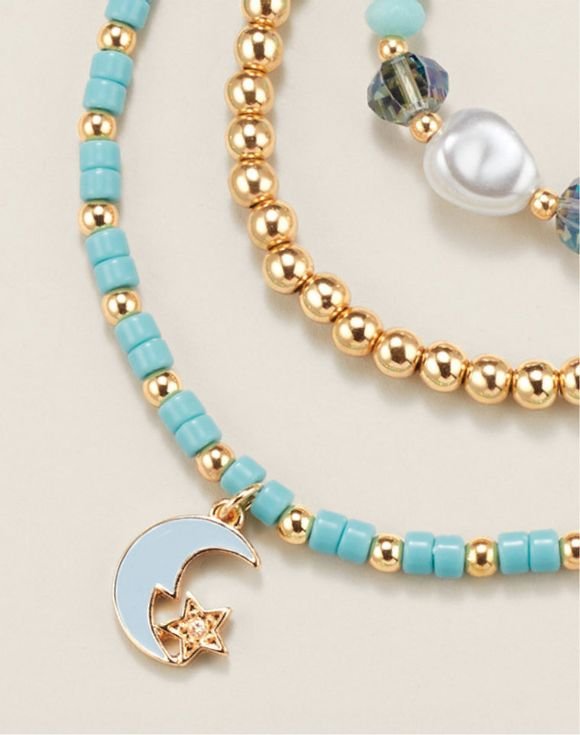 Embrace the beauty of the night sky. This layered necklace features a mix of semi-precious opal stones and blue and goldtone beads and is finished with a moon and star charm for a dreamy and sparkling look.
