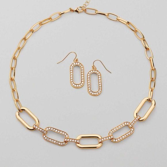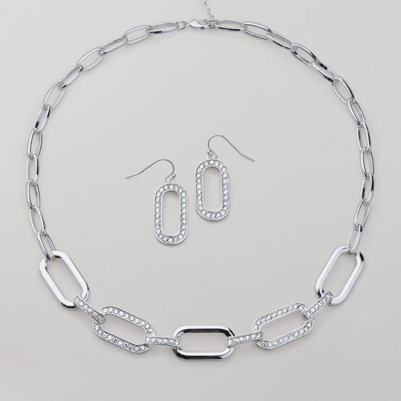 Simple yet sophisticated, modern open-link necklace and earrings are embellished with sparkling crystal pavé. Choose from goldtone or silvertone. Matching bracelet also available.