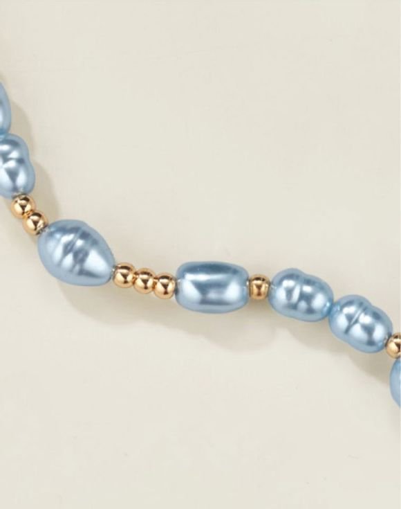 Lustrous pearly blue beads inspired by freshwater pearls combine with round goldtone beads in this timelessly beautiful necklace. Ideal for everyday wear, this shimmering piece adds a touch of refinement to any outfit. Matching hoops and bracelet also available.
