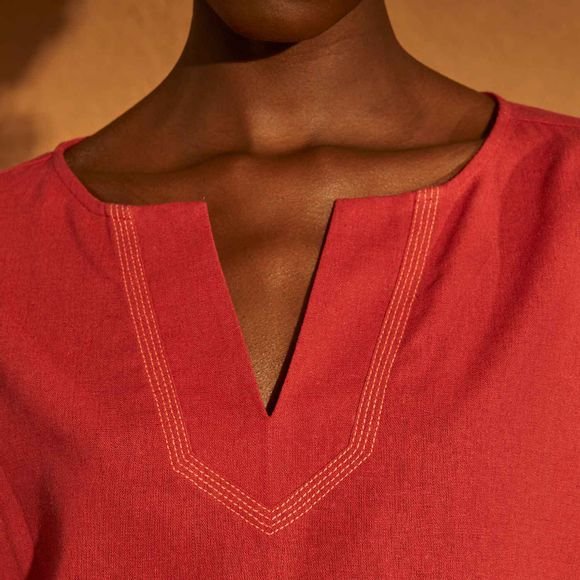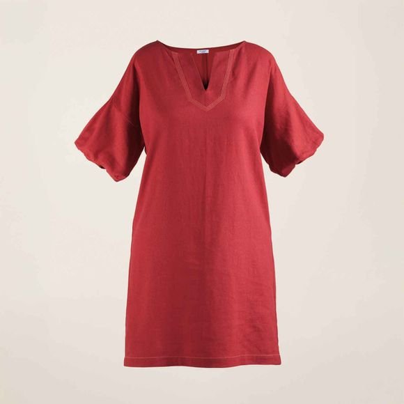 The minimalist design of this little red dress enhances the dramatic effect of the puff sleeves. A short shift style is accented with contrast stitching at the neckline. Center back length: 37″ on M; 38″ on 1X. Imported.