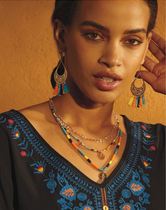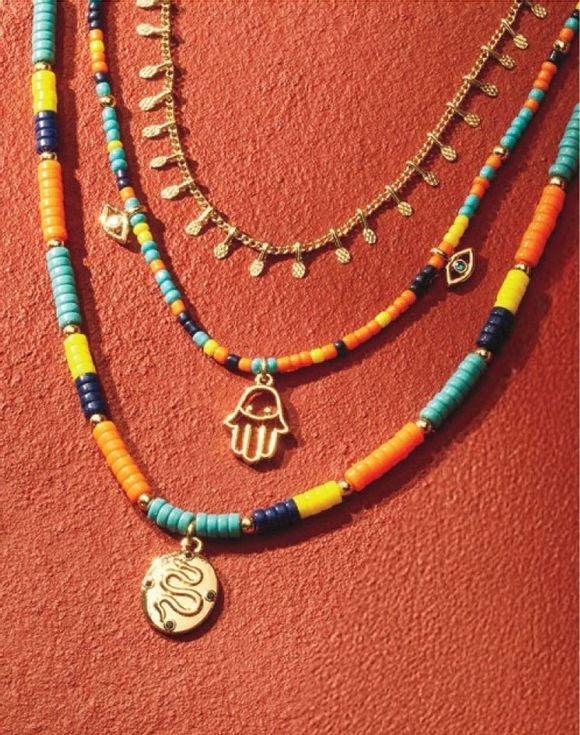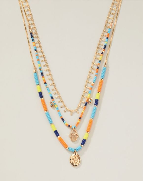 A three-layered necklace is brimming with artisanal flair thanks to its colorful beads and unique charms. The first two chains feature colorful beads, evil eye charms, a Hamsa pendant and a serpent-engraved coin pendant while the shortest layer is made of a goldtone bib chain. Matching earrings and bracelet set also available.