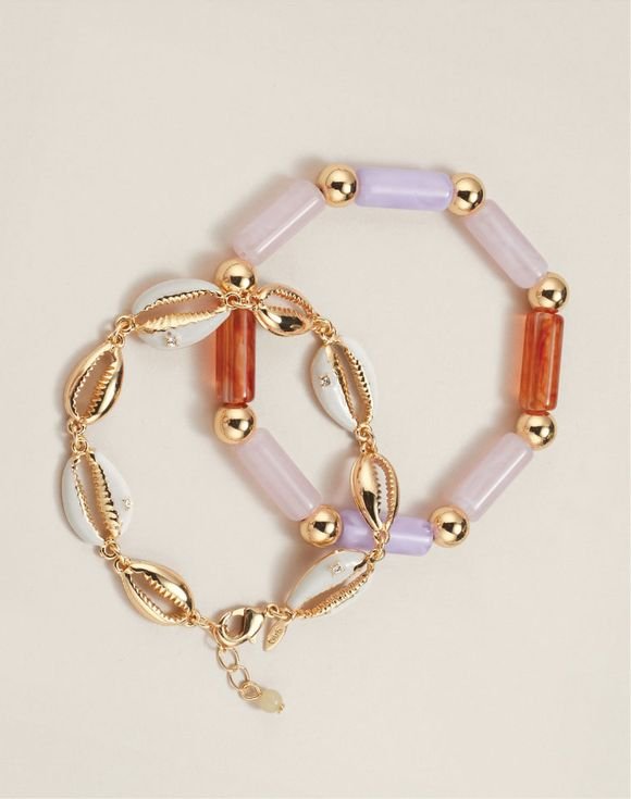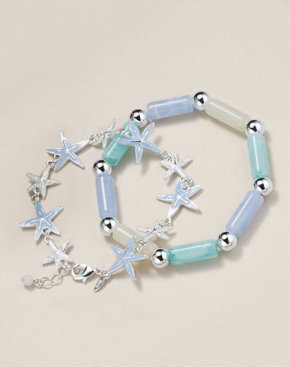Add a splash of fun to your ensemble. Set of two beaded bracelets feature a playful mix of pastel beads, glossy metallic accents and ocean-inspired charms. Available in two styles: teal/silvertone with starfish motifs and blush/goldtone with shell charms.