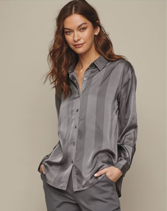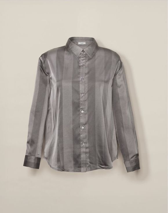 No longer just a neutral – gray is the statement this season. Add this sophisticated smoke gray striped satin shirt to your wardrobe. Featuring a collar, button-front style, rounded hem and long sleeves with buttoned cuffs, this relaxed-fit monochromatic style imparts maximum cool. Center back length: 27″ on M; 28″ on 1X. Imported.