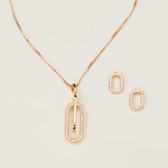 Classic lozenge links go luxe with a touch of sparkling pavé stones in this matching goldtone necklace and earring set. Matching bracelet and ring set also available.
