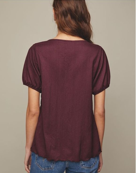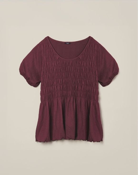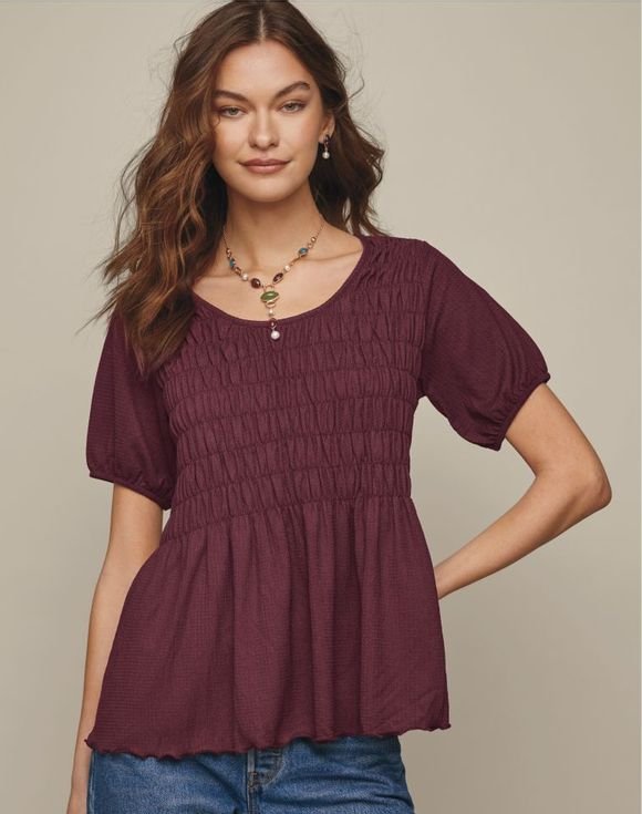 A smocked blouse that effortlessly transitions from day to date night. Detailed with front smocking, this wine-colored look has a round neckline, short sleeves and scallop edge hem. Center back length: 25 1⁄2″ on M; 26 1⁄2″ on 1X. Imported.