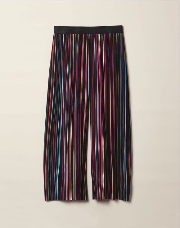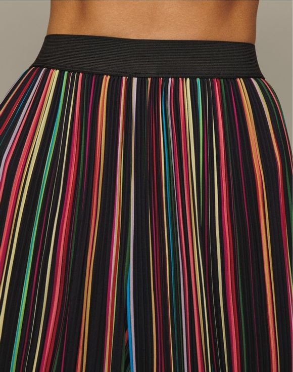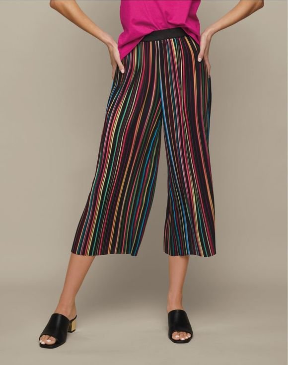 Cropped, striped and totally cool. Black and multicolor stripe pants with a pleated texture for a touch of interest. The wide-leg silhouette, elastic waistband and easy pull-on styling ensure a comfortable fit. Inseam: 23″ on all sizes. Imported.