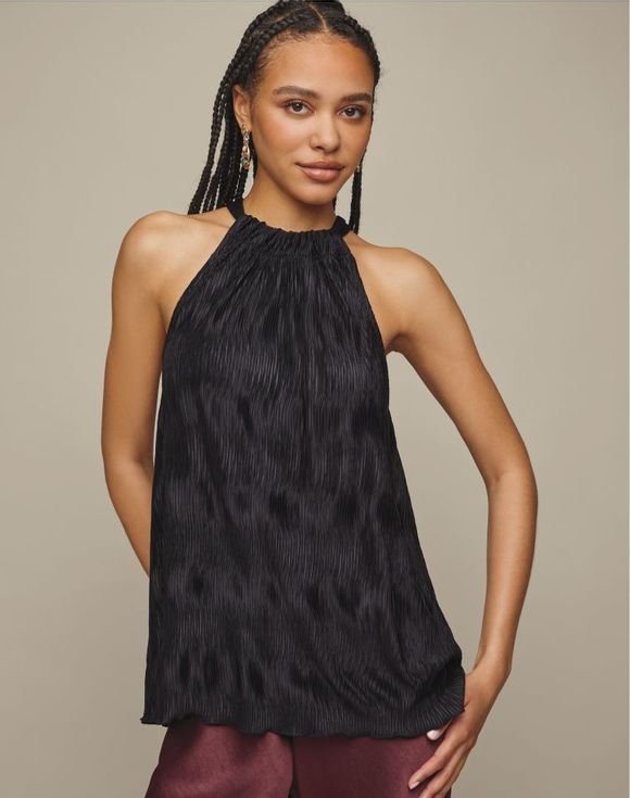 Turn up the texture with this striking halter top. Detailed with a keyhole and button closures at the back of the neck, this versatile black top is finished with a scallop-edge hem. Center back length: 24 1⁄2″ on M; 26 1⁄2″ on 1X. flat. Imported.