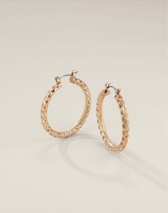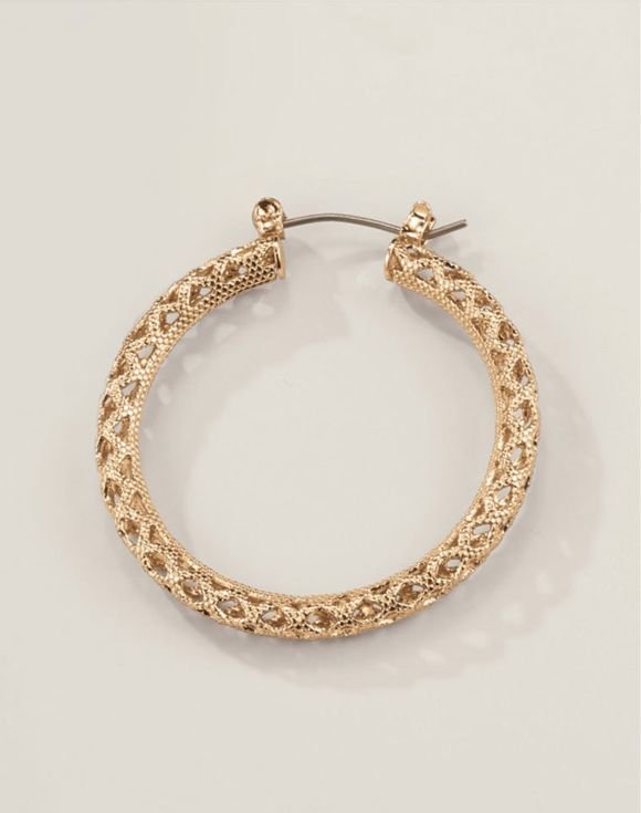 A beautiful twist on a classic goldtone hoop. Fanciful filigree wrap around bold hoops for an airy openwork braided effect. Matching necklace and earring set and pull-cord bracelet also available.