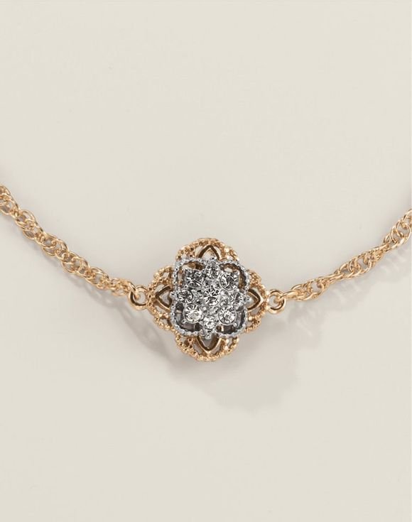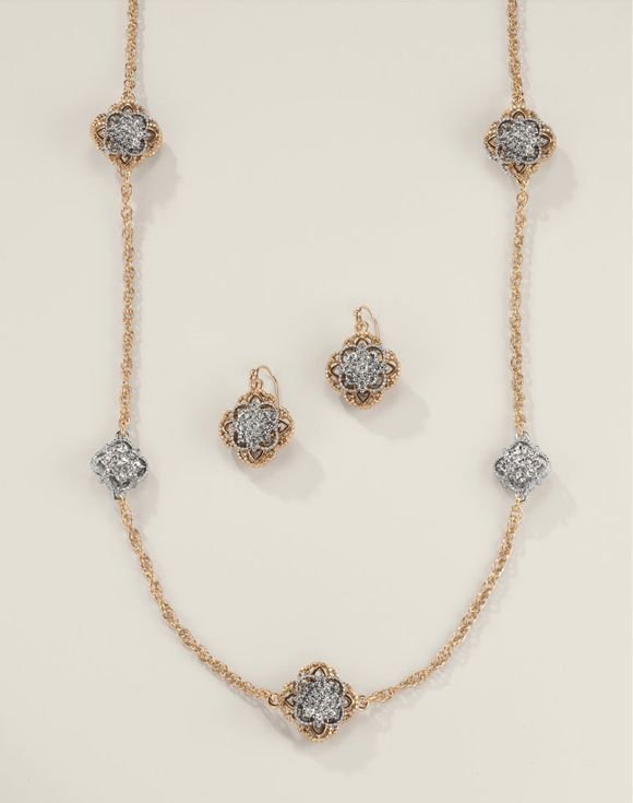 Delicate details paired with stunning sparkle combine to create an elegant necklace and earring set that will turn heads. Goldtone chain with intricate filigree detail is adorned with quatrefoil medallions of clear glass stones set in goldtone. Matching hoop earrings and pull-cord bracelet also available.