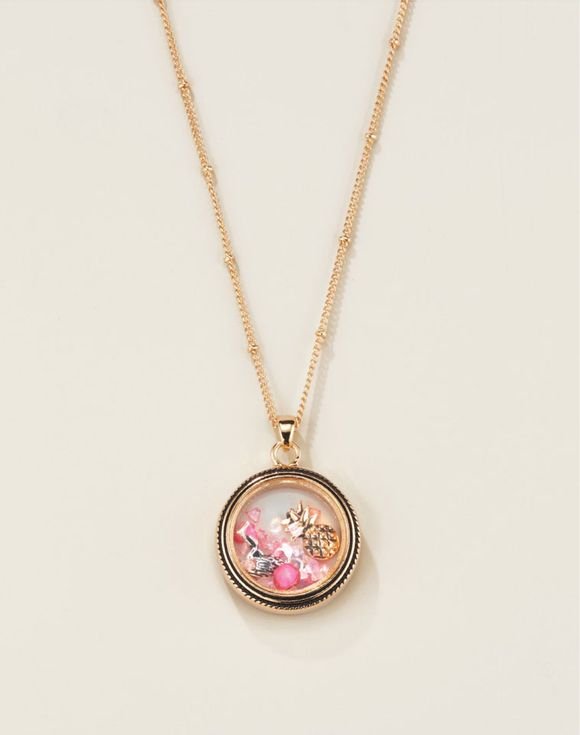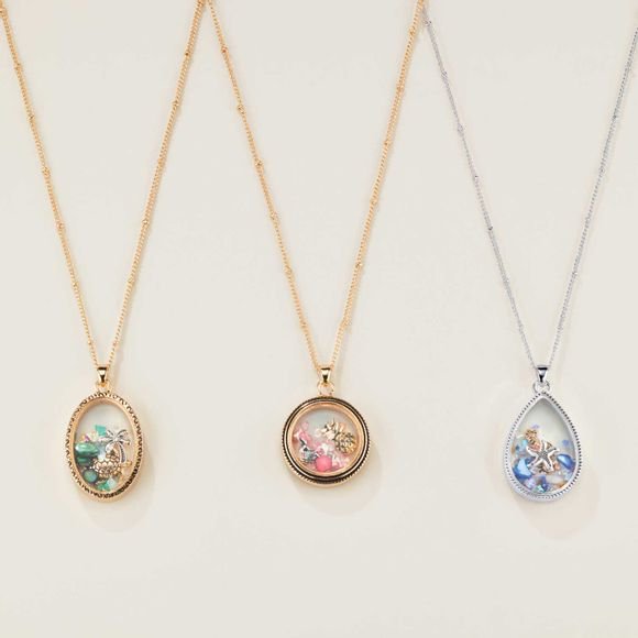 Carrying nature’s treasures, these unique shaker pendant necklaces display a sprinkling of colored stones and a mix of tropical charms. Choose your favorite from three different designs. The goldtone oval-shaped pendant showcases turtle and palm tree charms with green and iridescent white stones. The goldtone circle pendant showcases pineapple and flamingo charms with red and iridescent white stones. The silvertone teardrop pendant showcases starfish and seahorse charms with blue and iridescent white stones.