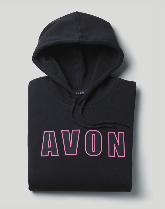Black pullover hoodie with drawstring, kangaroo pocket and black-and-pink logo. A wardrobe essential that’s sure to make a bold statement of our Avon pride. Center back length: 27½” on L. Imported.