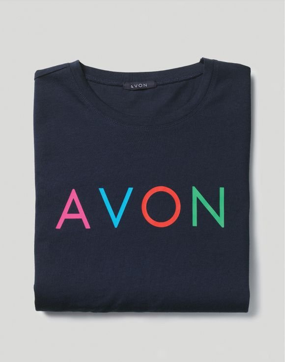 Navy crewneck all-cotton tee with short sleeves and multicolor logo. Wear it, share it and show off your Avon pride. Center back length: 29” on L. Imported.