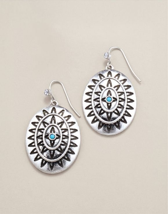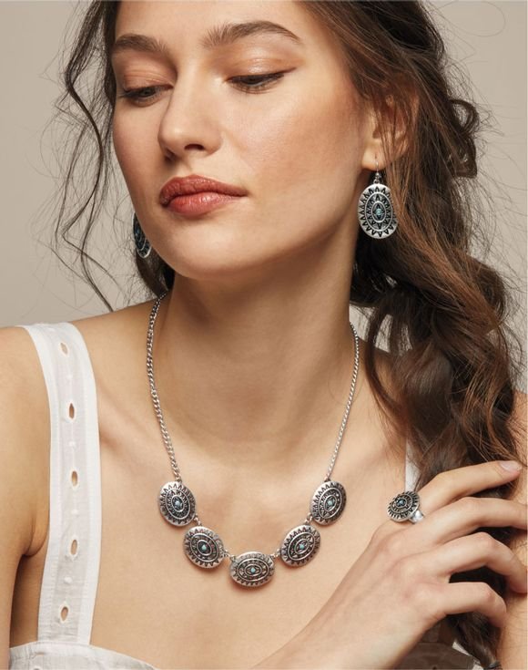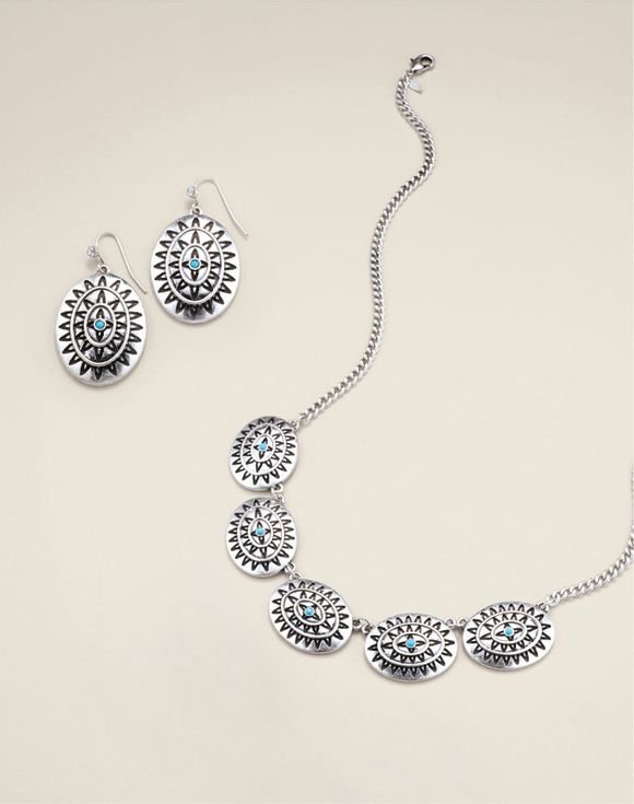 Featuring textured antiqued silvertone and turquoise-colored accent stones, this bold set brings rustic elegance to any look.