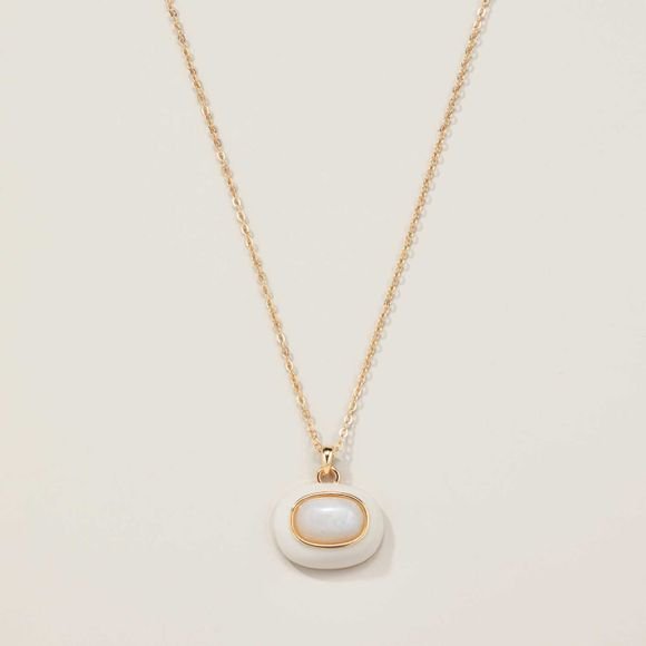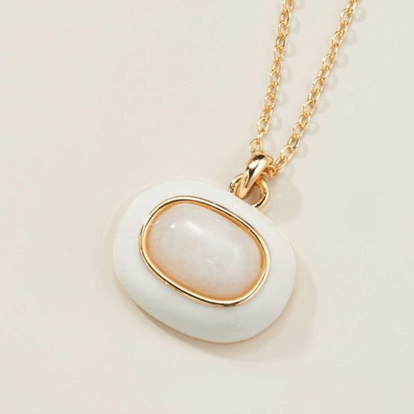The perfect blend of modern sophistication and timeless charm, this necklace adds a refined touch to any outfit—whether layered or worn alone. Featuring a delicate goldtone chain and a striking oval pendant, this piece showcases a smooth white quartz stone encased in a glossy enamel border. Matching watch, ring and earrings also available.