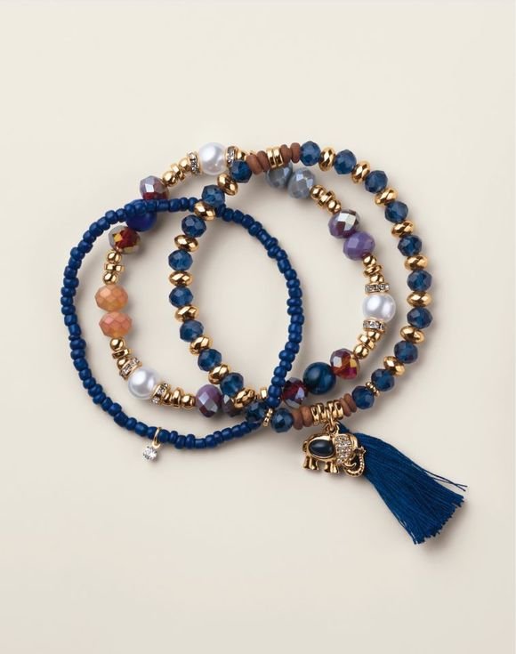 Stack on the charm with a touch of animal flair. A playful mix of colorful glass, pearly and wood beads with a delightful animal charm makes for instant arm candy. Available in three styles: owl (purple), elephant (blue) and fox (green).